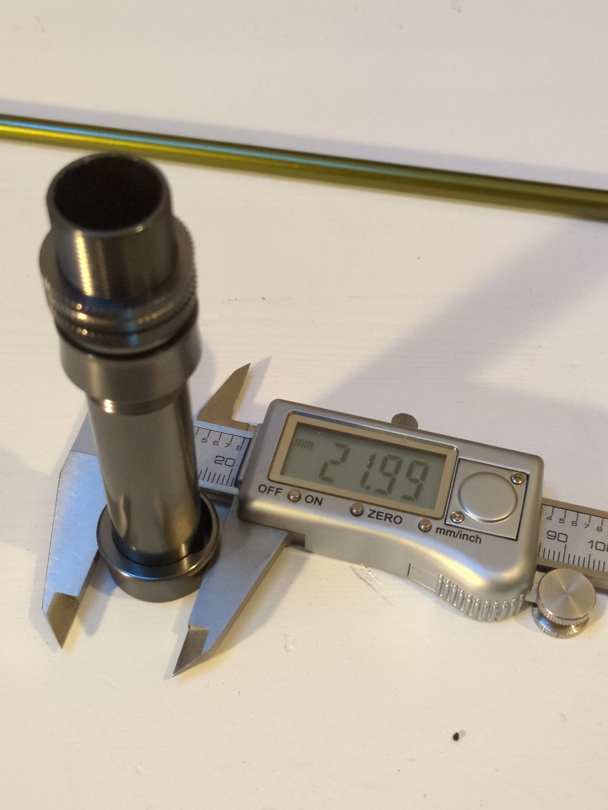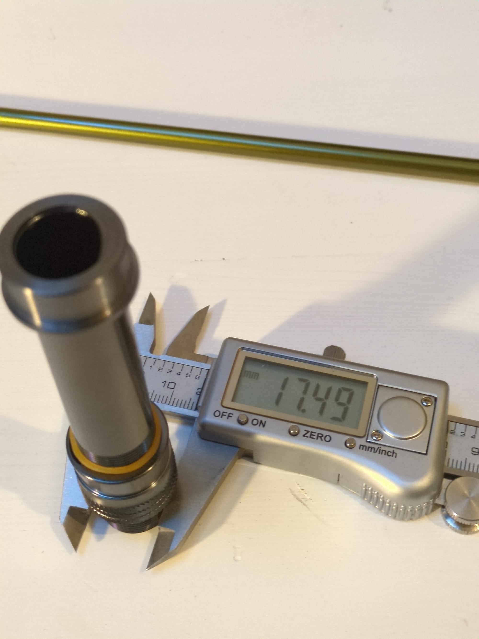 Mitataan vielä myös kelakiinnikkeestä kolme kohtaa. Laitan näihin 1-kätisiin kierteet aihion tyveä kohti ja upotan kelakiinnikkeen yläosan osin kahvan sisälle. Kuvista näkee mitä mitataan, eli kolme mittaa kelakiinnikkeestä muistivihkoon.